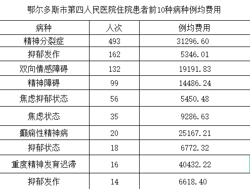 鄂尔多斯市第四人民医院2022年住院患者前10种病种例均费用